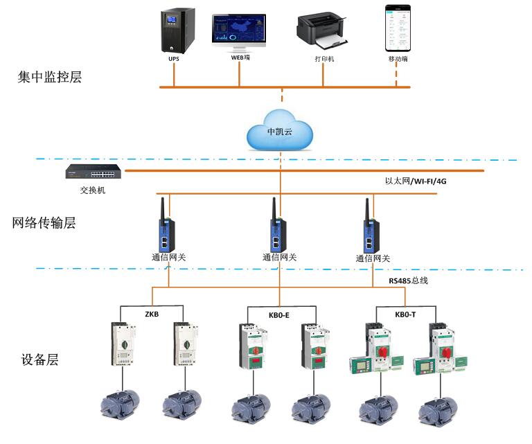 基于中凱物聯(lián)網(wǎng)云平臺的電動(dòng)機智能監控系統,以可通訊KB0作為電機控制與保護的核心元件,并實(shí)時(shí)采集電動(dòng)機數據包括:實(shí)時(shí)電流、實(shí)時(shí)電壓、故障信息、整定參數等,通過(guò)中凱智能網(wǎng)關(guān)上傳至中凱云平臺。